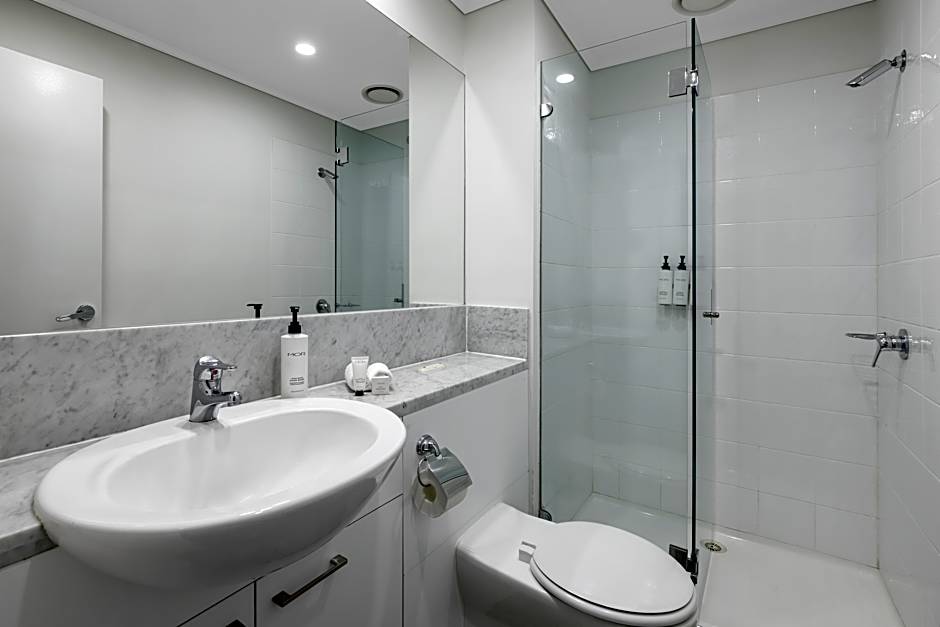 Located on level 9 and 10, with 2 bathrooms, this self-contained apartment offers a full kitchen and laundry facilities. The bedrooms are separate from the living/dining area, providing lots of space for relaxation or business.